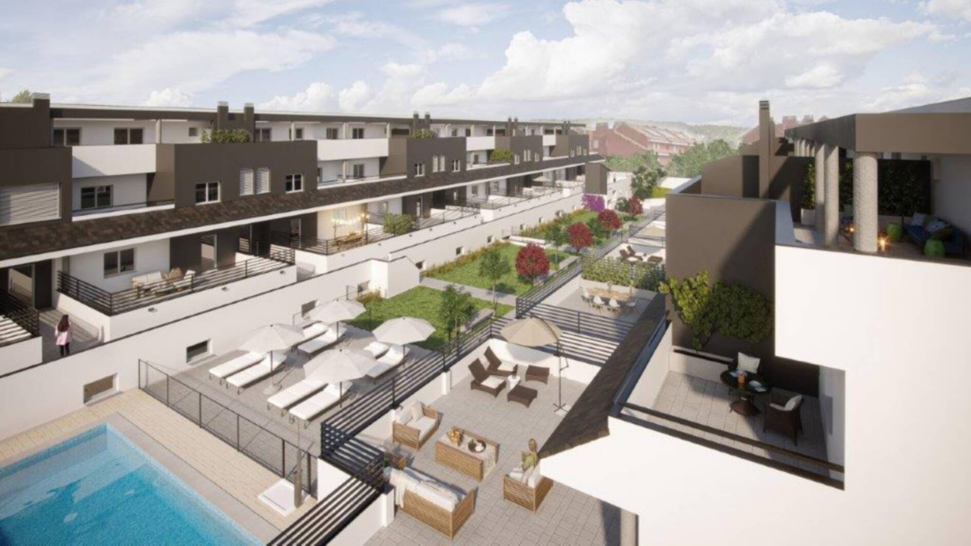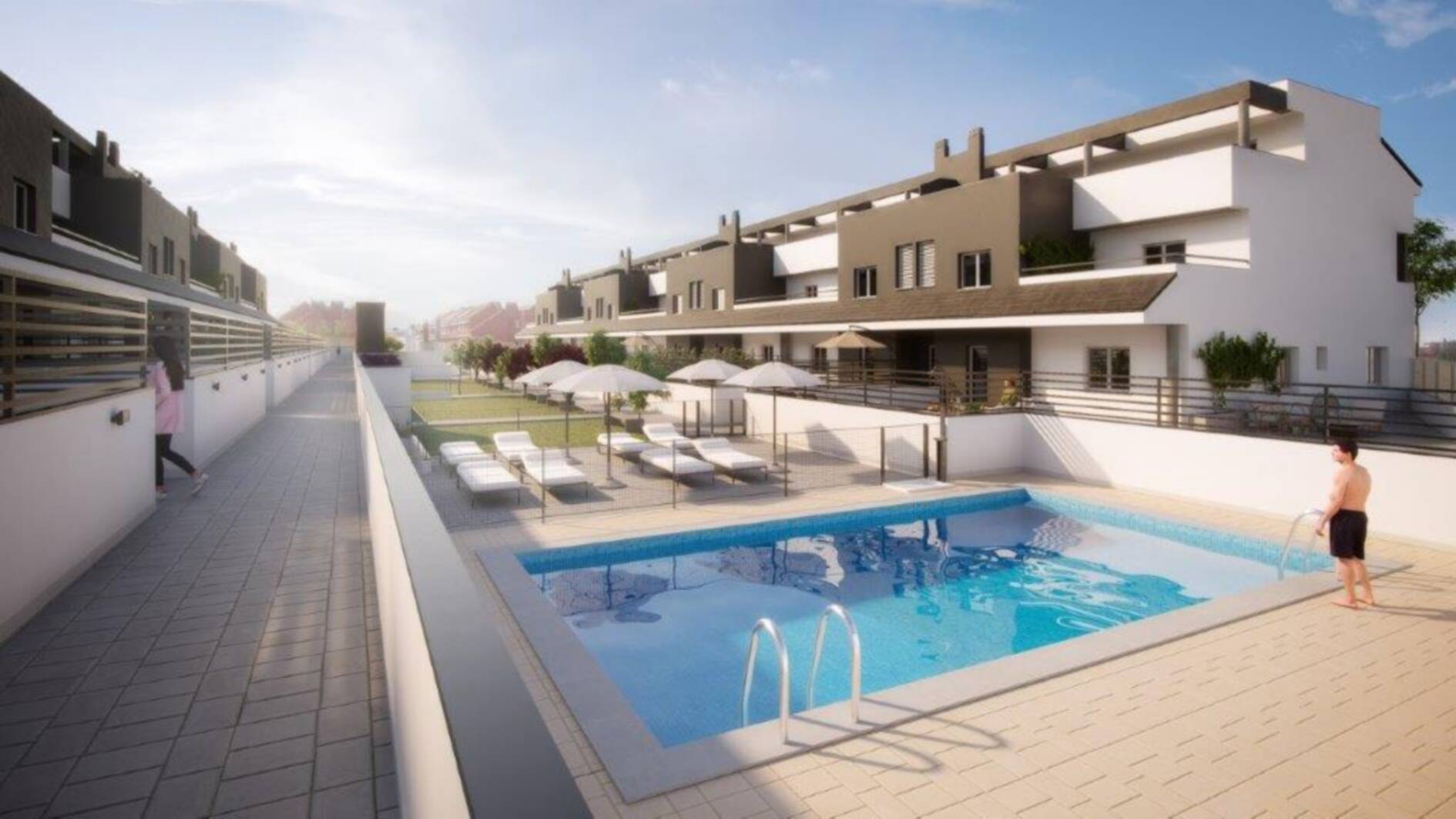 Promoción de 33 viviendas en la calle Letonia 6, esquina con Estonia, 5 y Paseo de Maastrich, en Meco. Viviendas de 2 y 3 dormitorios con terrazas, zonas ajardinadas, piscina comunitaria y espacios exteriores pensados para el confort y la convivencia